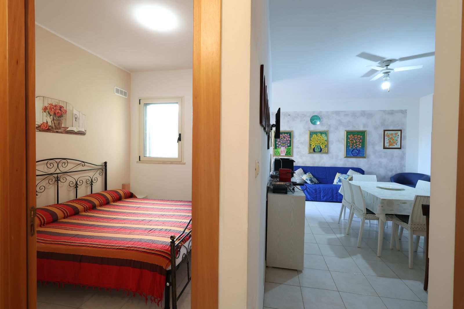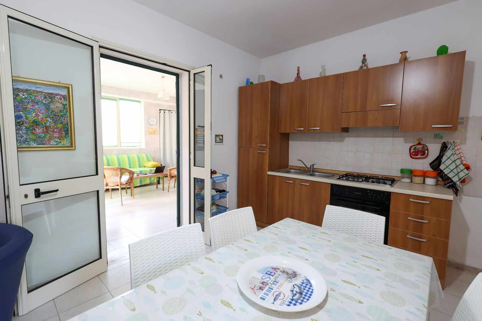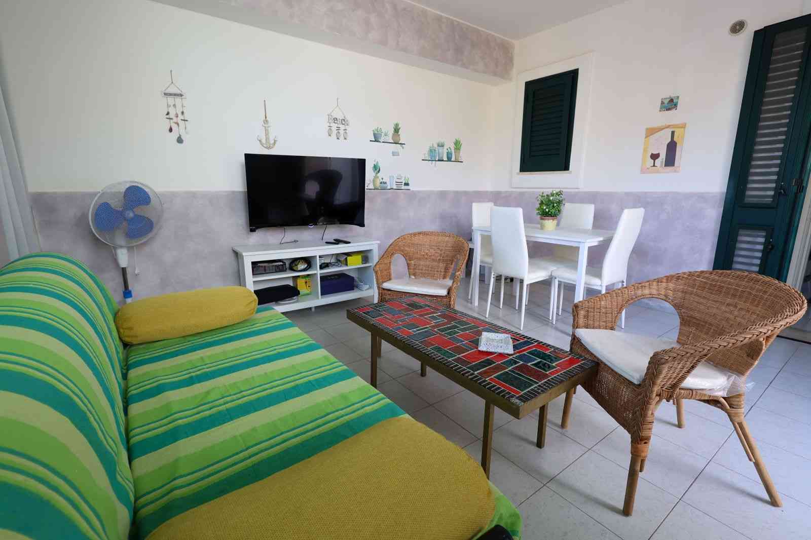 L’appartamento si apre su un ampio e accogliente soggiorno, il luogo perfetto per il relax post-spiaggia, attrezzato con un divano letto matrimoniale e un letto singolo per ospitare comodamente tutti i vostri cari. La zona notte offre due camere matrimoniali ampie e luminose, garantendo un riposo rigenerante dopo una giornata di sole. La cucina è indipendente e completamente attrezzata, ideale per chi ama preparare i sapori del territorio in totale autonomia, mentre i due bagni della casa assicurano la massima praticità anche ai gruppi più numerosi (fino a 7 posti letto).